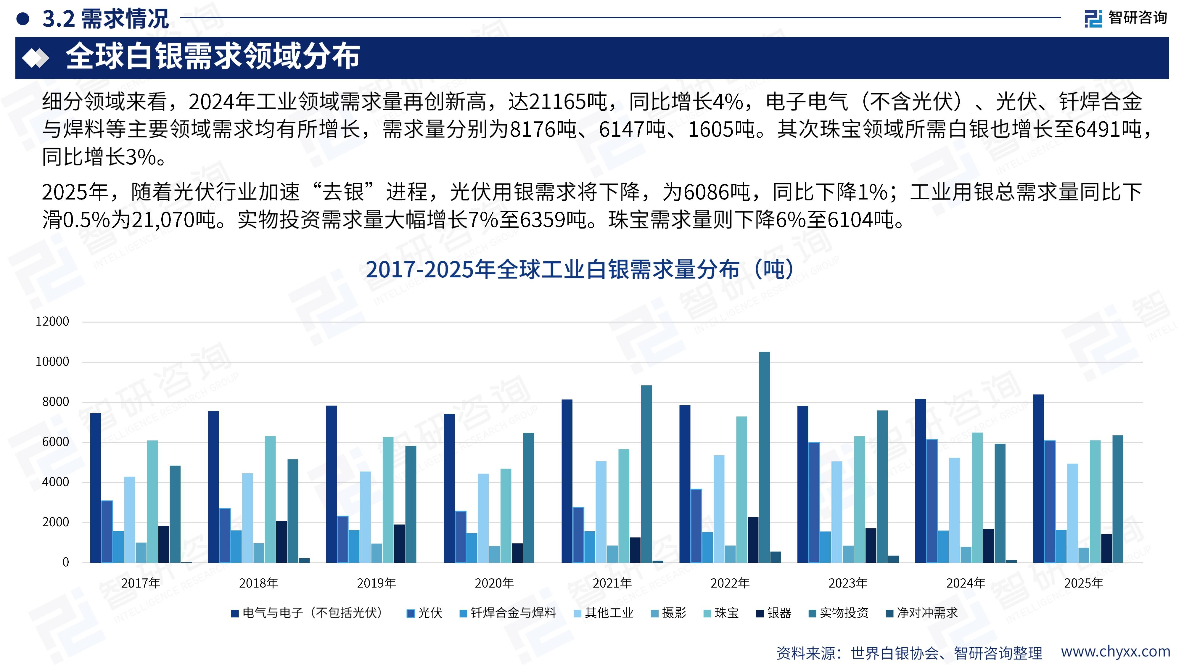 • 光伏领域:随着N型电池技术的渗透,全球光伏装机量预计达600GW,带动白银需求增至0.65万吨,同比增长20%。光伏用银已成为工业白银需求中最大的单一领域。
